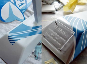 1:00amデカール完了/2:30am研ぎ出し完了、スタンド完成/3:00am名刺作成/5:00amコニ−以外の梱包完了、一旦本業に戻る。/9:00pm本業完了。朝一納品/12:00現在ちまちま仕上げ中。ここへきてミス連発…13:00ヒートプレスに初挑戦。やっぱ、クリアやのう。(左)