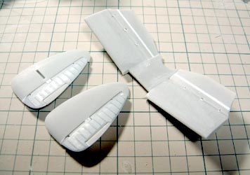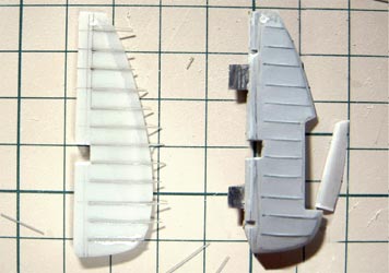 ●尾翼の完成 元のキット数に戻りました。(当然キットは可動翼も一枚もんなので。)エレベーターは寸足らずでしたのでプラ板を挟んであります。今回は資料をよく見て作るつもり。 |