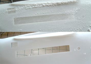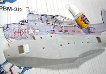 ●テキトースジ彫り あっはっは。ハッチだの機銃庫だのせっかく作ったのに。地雷踏みましたです。ちゅどーん!窓の位置は合っている模様、しめしめなんて思ってふと見やればせっかく開けたガンナーズハッチ大きさも比率も違えば、位置もさっぱり。おまけにパネルラインも適当に彫っときました状態。あっているのは基準線と書いてある僅か1本のみ。まーた最初からかよぅ。自信ないパネルラインなら彫らずに放っといてくれや。埋めて引き直し。 |